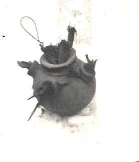 6. A 12" figure bound in cowries (a type of small white shell) ovu ngwugwu = god which confiscates the property of the dead. All of these were carved by one man named Njoku. 7. ukwu-agwu ( a semi-circular standing arch) "A person who often receives a wound on his leg, or stumbles, or stubs his toe often, comes to appease it." My notes indicate that Njoku lives nearby, and his son is named Njoku. 8. A small five-eyed pot unu, made in Umunumo village near Osu. It has four spouts on the side, "pour palm wine in there, and whatever (you) say afterward comes true and is often used at times of war to ensure success.