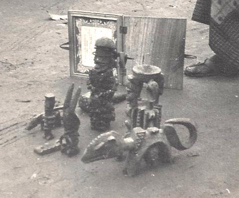 I will attempt to describe some of them and their purpose, as pictured in the field photos below. The best discussion of these I have found is in the book Igbo Arts- Community and Cosmos, by Herbert M. Cole and Chike C. Aniakor, pp 72-74, which I recommend. Many pieces are pictured there. From 1965 to 1966, I collected several pieces identical to those shown on the pages of Cole's book. In the Gallery above, dozens of divination pieces are presented on pages 13-19, including small ikengas. In the individual pictures there, the Detailed Documentation window can be entered to see whatever provenance I was able to obtain for each piece at the time.