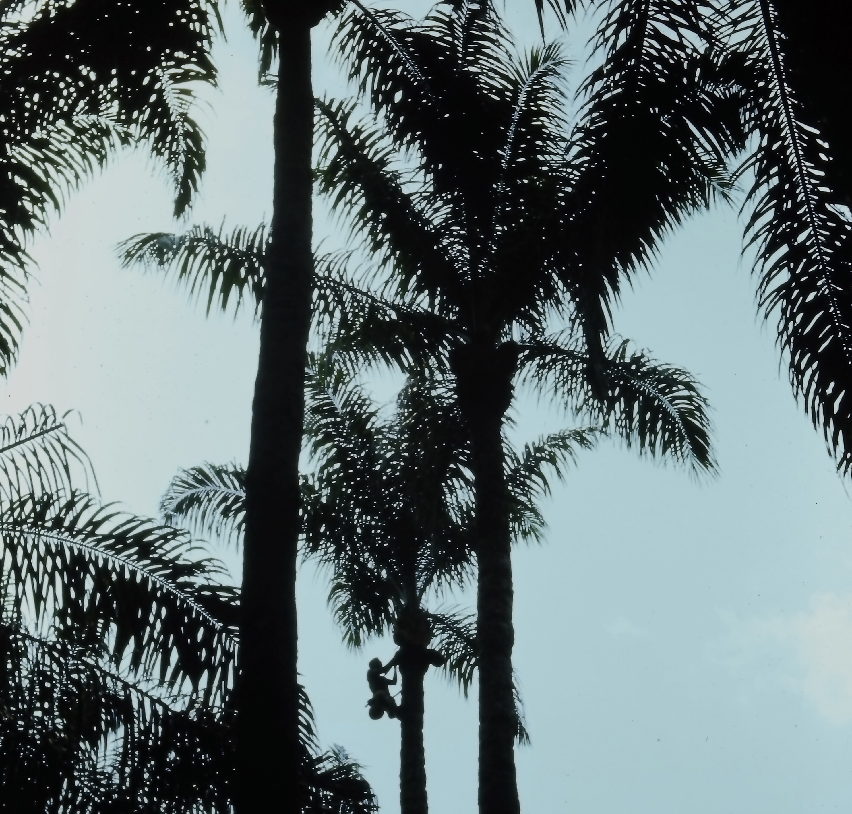 I noticed that the palm wine tapsters had graduated to using 5-gallon glass carboys instead of round pots. They strapped the carboys to each side of the rear wheel of their bikes to collect and distribute their intoxicating juices. Can you spot the tapster in the tree?