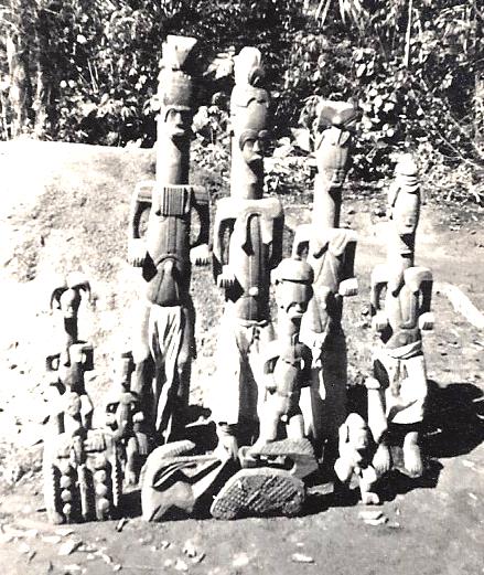 They told me the tall male figure (far left) is named "Ezealaogaku", or alternately "Ezealaogugo". They told me (quote), "These two (including the wife next to him) have got sons and daughters (gods and goddesses) who have become gods and goddesses of smaller areas." They said the shorter male figure (third from the left, third tallest) is "the prince, who will take the place of the Ezealaogaku", and therefore "his leg must not touch the ground until he takes over (?!)". "He sometimes demands things that his father does not like to give him, like having a beautiful girl sacrificed to him. This young one can cause much trouble by sending out the father's counselors to do his deeds. He can dry up the Mba River for two to three weeks until the priest can discover what is wrong."