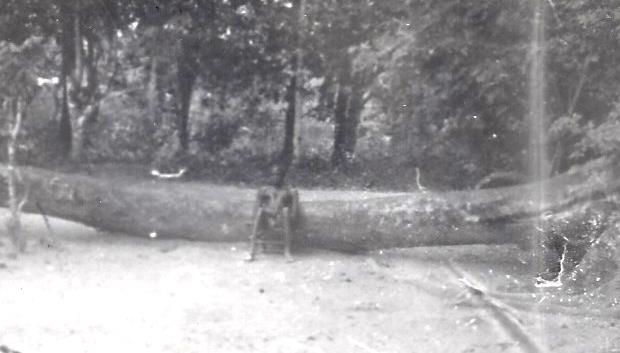 This is a simple shrine about to get a new palm frond roof. It was located in Inyi in a clearing not far from carver Aka Gworo's compound. It is an example of a shrine with no carved statues but only shallow pots set into a mound of dirt to receive gifts of appeasement. The second picture shows a simple shrine nestled in the roots of a giant tree located near the compound of the dibia in Umueme-Inyi. The pots are there to receive small sacrifices and gifts of appeasement. The third picture shows a giant fallen tree blocking the road. The man sitting there was blind, but, none-the-less, the keeper of the ikoro.