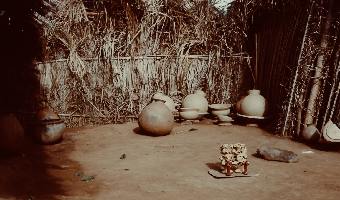 That superior quality shows in the gray clay with the great detailed work of his intricate ceremonial pots'. I have a few photos of those'. They were of superb detail and quality'. I had one shipped home with my masks, but it had not been fired, only air-dried'. Unfortunately, it did not survive the jostling in the hold of a ship crossing the Atlantic Ocean on its way to me.